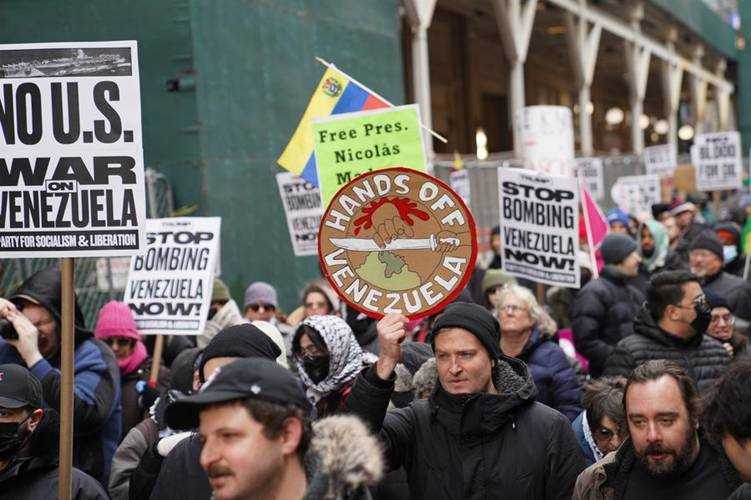 People take part in a protest against the U.S. attacks on Venezuela in New York city, the United States, on Jan. 3, 2026. (Xinhua/Zhang Fengguo)