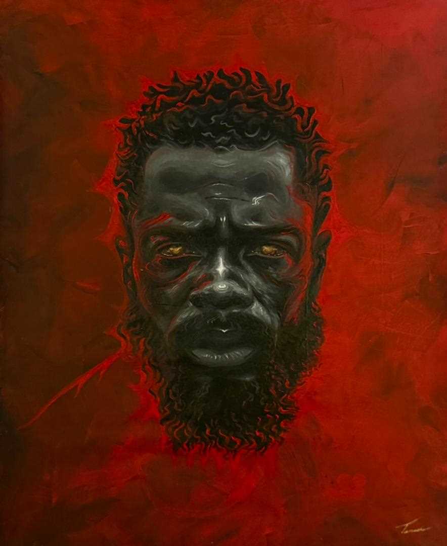 His artistic style blends classical portraiture techniques with contemporary African expression. Deep reds, blacks and gold accents dominate his palette, creating a sense of intensity and reverence.
